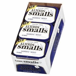 Description : Altoids Mints Smalls Nordic Mint - 9 count box. Packaged in a convenient pocket-sized tin, these mints make it easy to keep your breath fresh throughout the day. Altoid Mints smalls contain a strong flavor that stimulate your tastebuds. There are 9 tins of the new Nordic Mint flavor and each contains .37 ounces or approx 50 mints per tin.