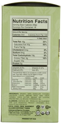 Description : Endangered Species Chocolate Organic 64 ct. Box – Organic Dark Chocolate with Deep Forest Mint (70% Cocoa Content) A box of Chimp Mints includes 64 certified organic, ethically traded, individually wrapped, .35oz. bite-sized squares of dark chocolate inf