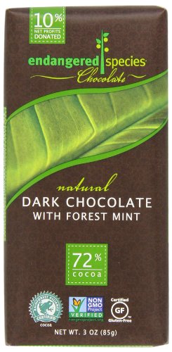 Description : Endangered Species Chocolate All-Natural Rainforest Bar - Dark Chocolate with Deep Forest Mint (72% cocoa content) This 3oz. mint chocolate bar is made with all-natural, shade-grown, ethically traded rich dark chocolate with a hint of all-natural deep fo