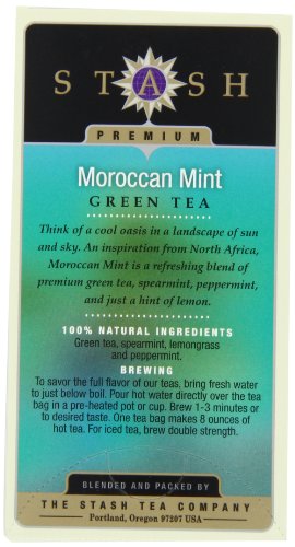 Description : The Stash Tea Company is headquartered in Portland, Oregon. Founded in 1972, the company derives its name from an entertaining aspect of tea folklore. In earlier centuries, tea was a valuable commodity traditionally transported by clipper ship. The ship's captain often was presented with some of the finest teas for his personal use. This supply was his "stash", stowed carefully as his "private reserve." Today, the term still is used to denote anything put away carefully because of its preciousness. Stash Tea has been committed to providing premium quality teas and an unsurpassed tea drinking experience. Stash begins with simply excellent tea leaves from the world's premier tea gardens and all natural botanical ingredients gathered from around the world. Meticulous blending and tasting of every tea ensures you will enjoy full flavor in every cup. An inspiration from North Africa, Moroccan Mint is a refreshing blend of premium green tea, spearmint, peppermint, and just a hint of lemon. Green teas are steamed fresh from the garden, preserving color and natural flavor and leaving them rich in antioxidants.