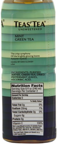 ITO EN Teas’ mint green tea is an all-natural brew of premium loose green tea leaves and select, real peppermint leaves--enjoy the pure refreshment of this invigorating blend."Drink for yourself" to taste the distinction of a beverage alternative that is healthy and designed for an active lifestyle. Made with nothing but purified water, green tea, dried peppermint leaves, and vitamin C, this unsweetened tea is meant to revitalize and renew. With approximately 45 mg of caffeine per 16.9 fl oz, this tea contains more than 100% or more of the daily value of vitamin C and is high in antioxidants. This is sold in a pack of twelve 16.9 fl oz bottles.