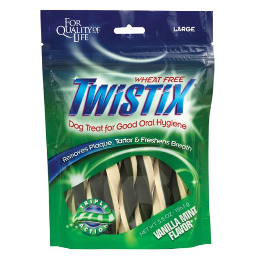 Description : Twistix Vanilla Mint Flavor is a highly palatable oral hygiene chew treat for dogs that uses co-extrusion technology for triple action cleaning power. The green portion contains peppermint, parsley and chlorophyll to freshen breath, while the white portion contains sodium hexametaphosphate, which helps prevent the formation of plaque and tartar. The delicious addition of vanilla to this minty fresh dental chew treat makes for and ideal palate pleaser. Wheat and corn free. No added gluten, salt or sugar. Highly soluble and low fat. Vanilla mint flavor. Small = 14 pack (approx. 2 3/4" long). Large = 7 pack (approx 5 3/4" long).